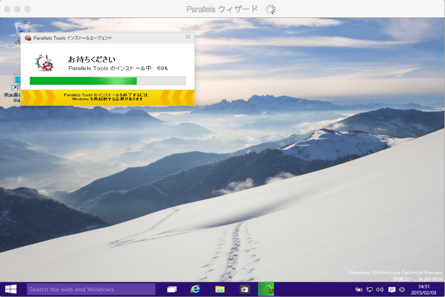 その後、parallels toolのインストールが始まります。